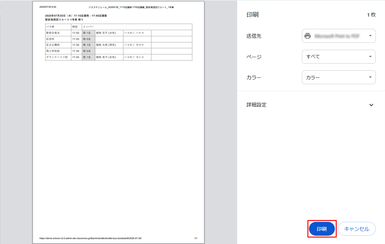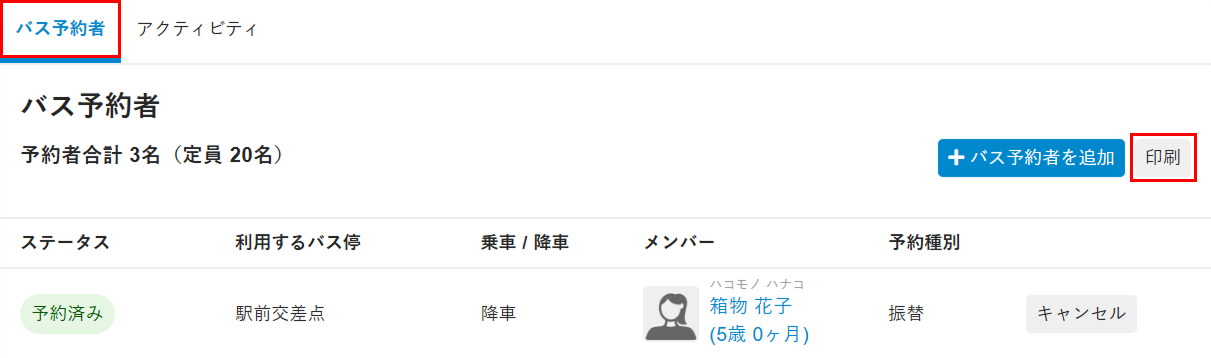 [バス予約者]タブを選択し、[印刷]をクリックします。