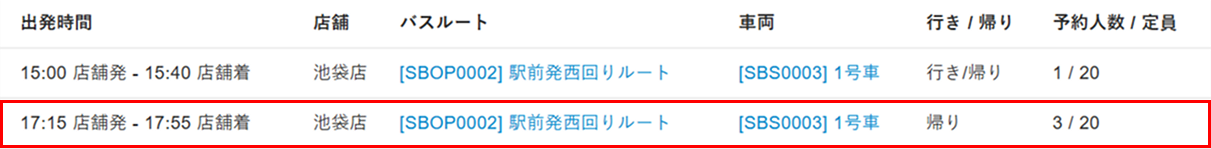 - バススケジュールの一覧画面で、予約者一覧を印刷する店舗と日付を選択します。