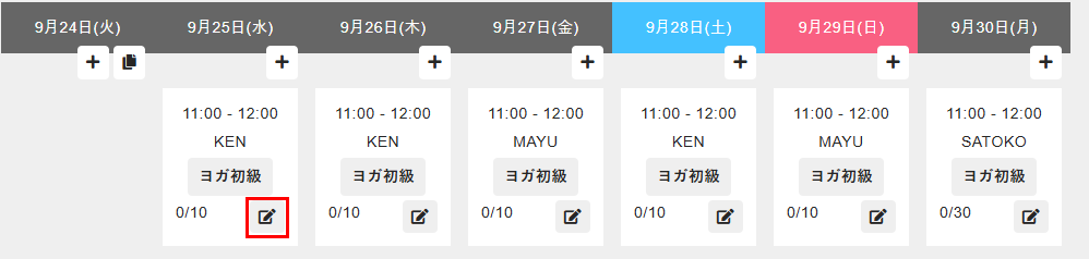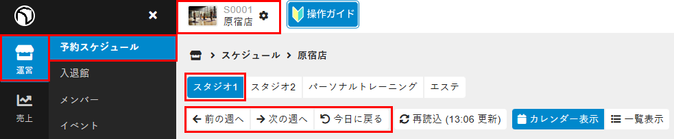 - 管理サイトのサイドバーから[運営]>[予約スケジュール]を選択し、店舗名、予約カテゴリ、レッスン日の週を選択します。