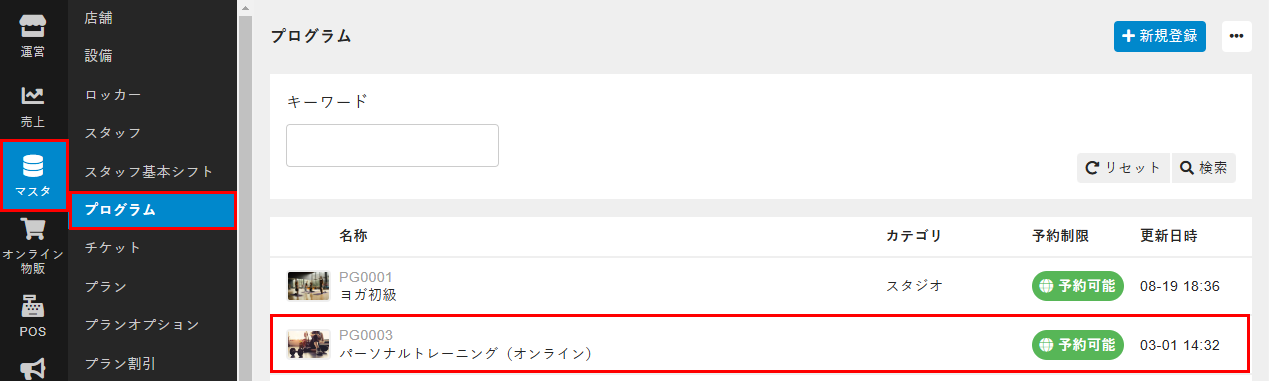 - 管理サイトのサイドバーから[マスタ]>[プログラム]を選択し、プログラムの一覧画面で対象のプログラムを選択します。