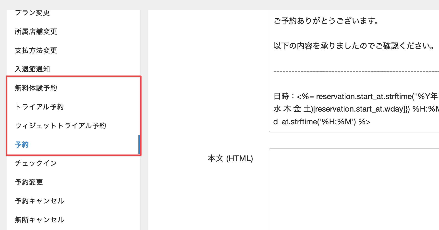 - テンプレートの一覧から、設定対象の予約のテンプレートを選択します。