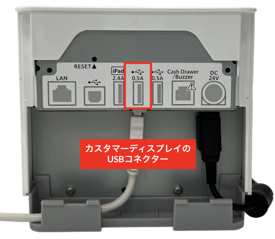背面の左右にある隙間に爪をかけて、片側ずつ取り外します。 - カスタマーディスプレイのUSBコネクターをプリンターのUSBポートに接続します。