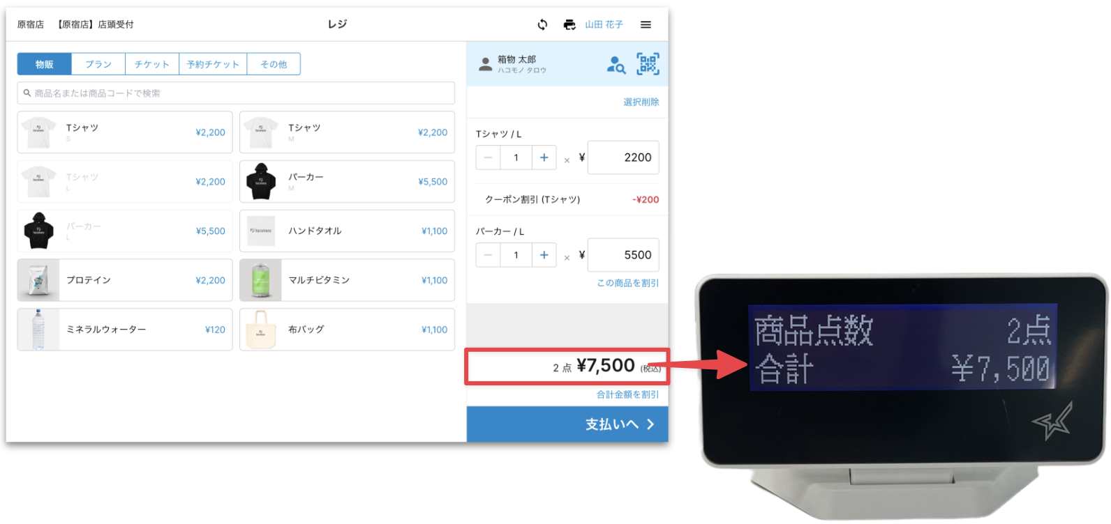 レジ画面で商品をタップし、カート内の商品の合計点数と合計金額がカスタマーディスプレイに表示されることを確認します。