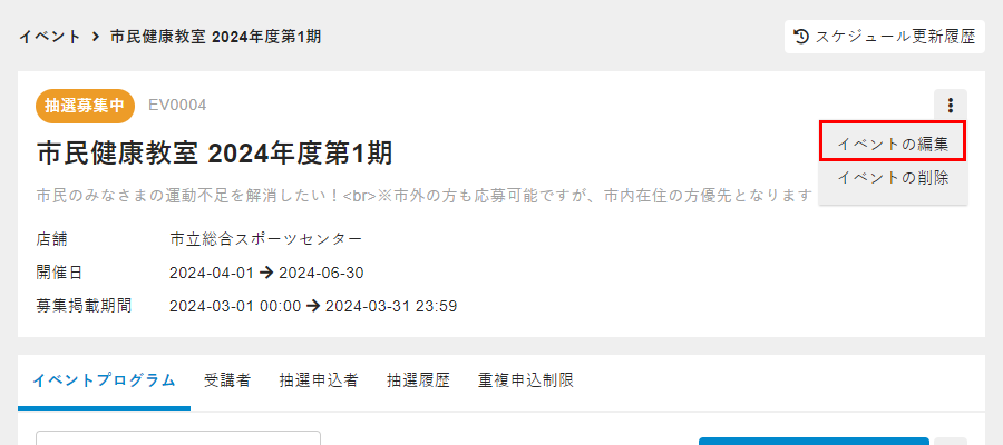 - イベントの右上の[?]をクリックして[イベントの編集]を選択します。