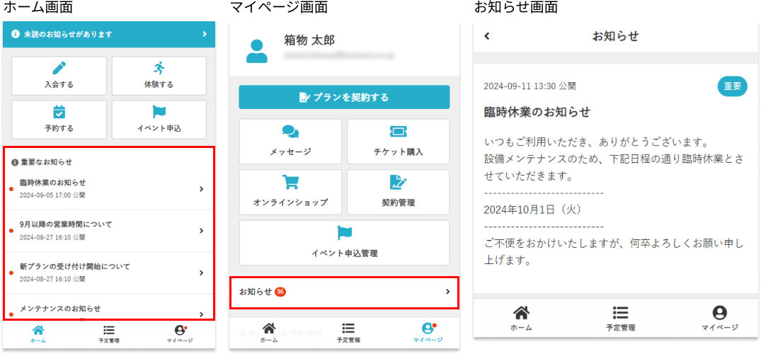 Note:お知らせ掲示機能による連絡は、店舗からお客さまへの一方向となります。お客さまから返信等のリアクションできません。