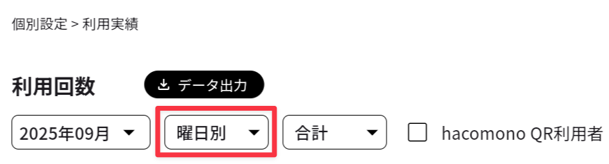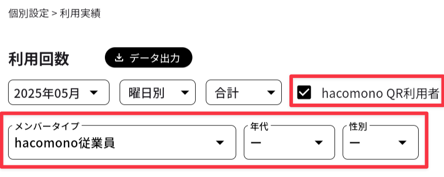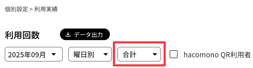 - メンバーコード(QRコード)の読み取りで予約されたメンバーの実績のみ表示する場合、[hacomono QR利用者]にチェックを入れます(「hacomono連携を設定する(予約ボード)」を参照)。