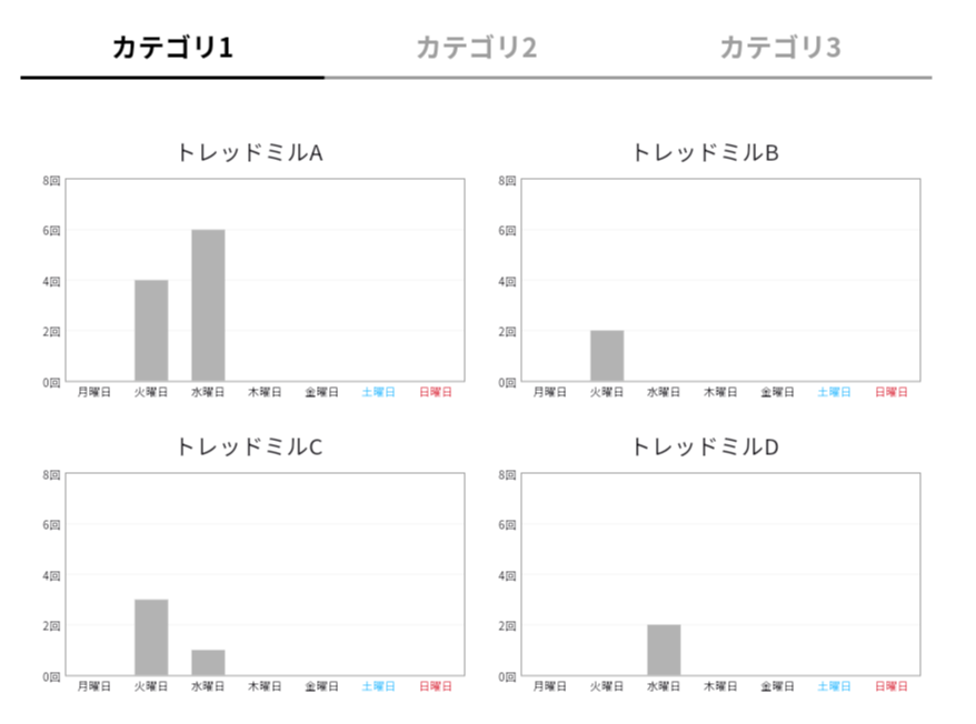 指定した1ヶ月分の予約回数(利用回数)の実績値について、以下の集計結果をグラフ表示で確認できます。