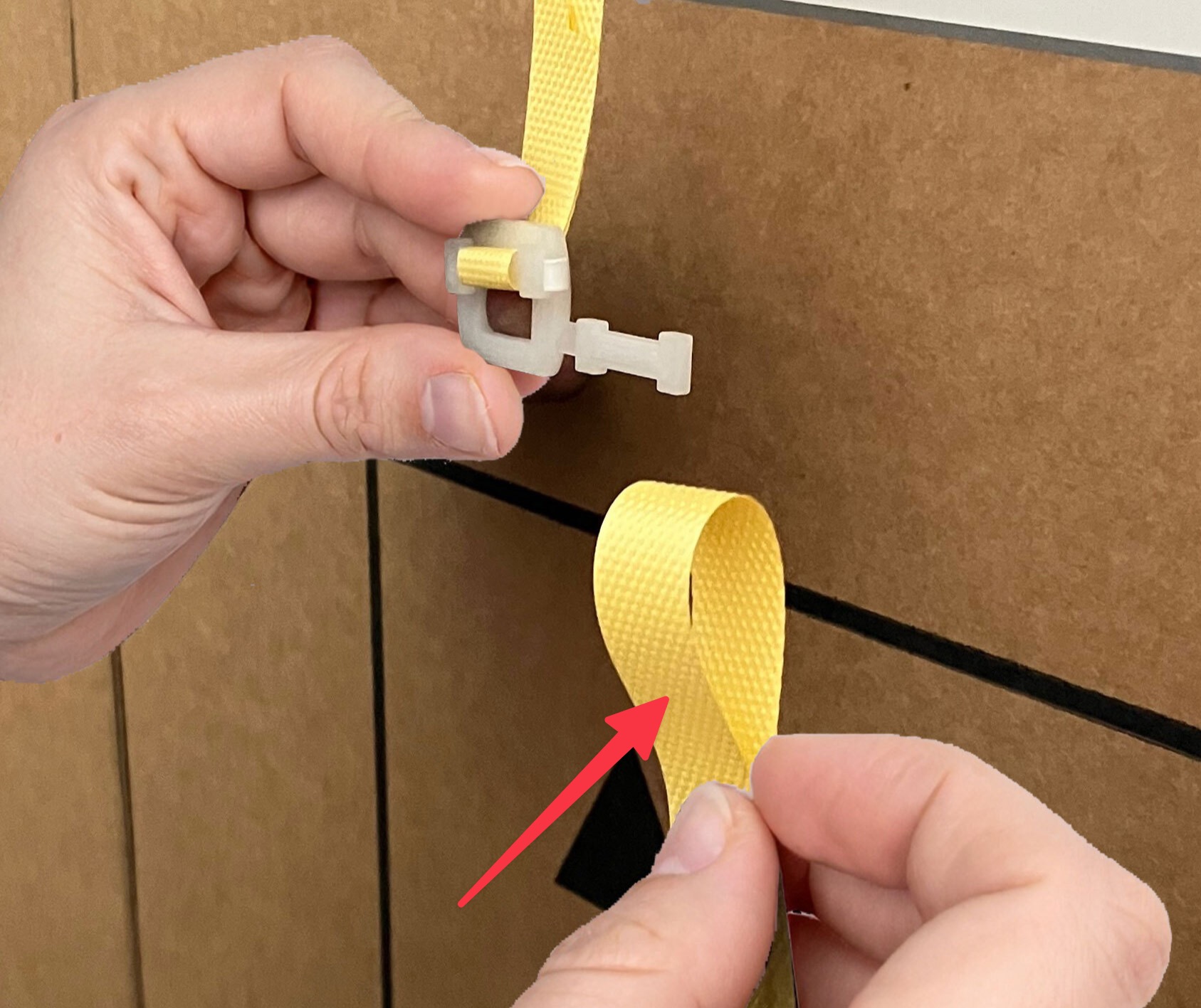 - ストッパーの上側の足を折り曲げて紐の輪に差し込みます。