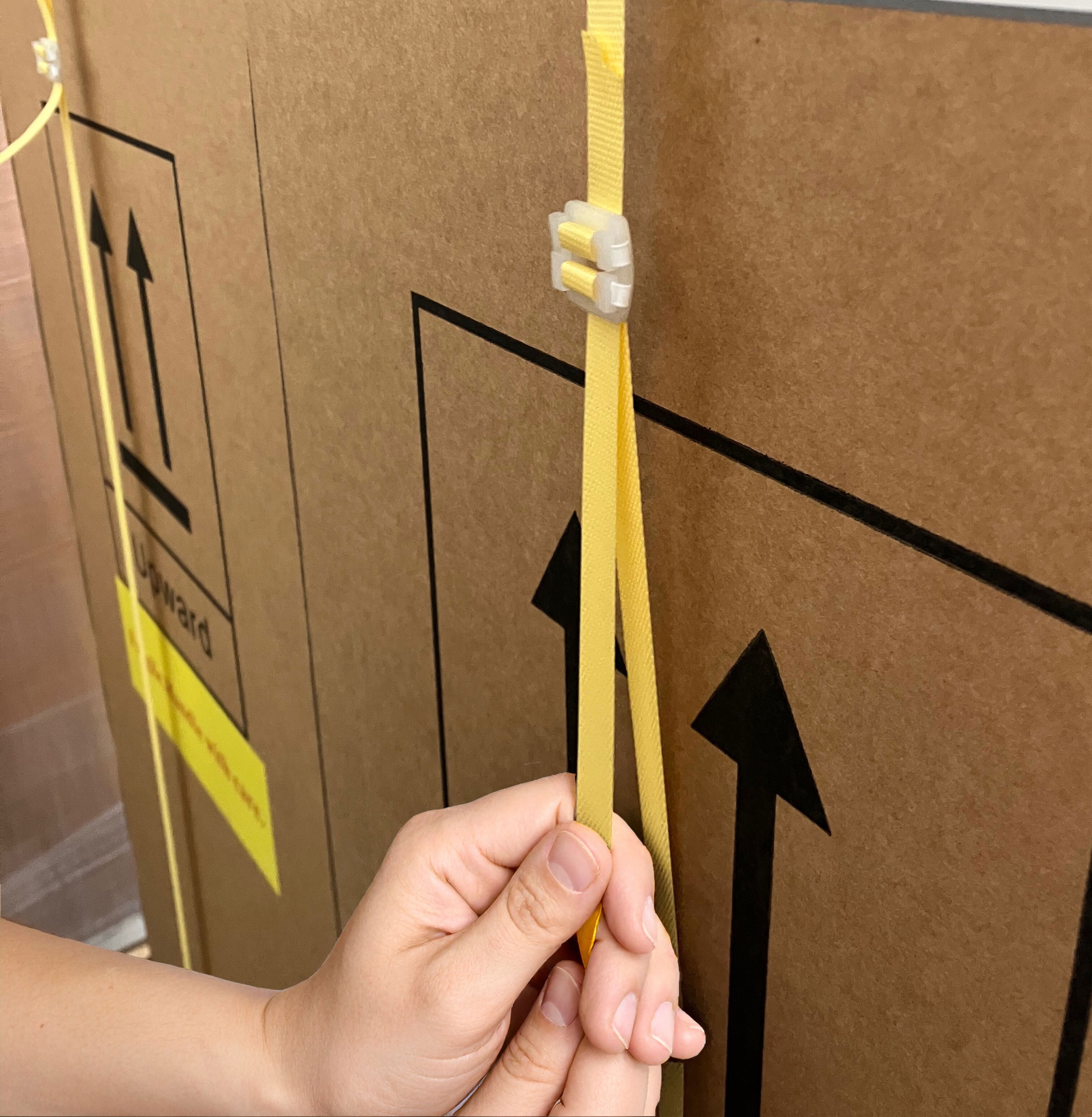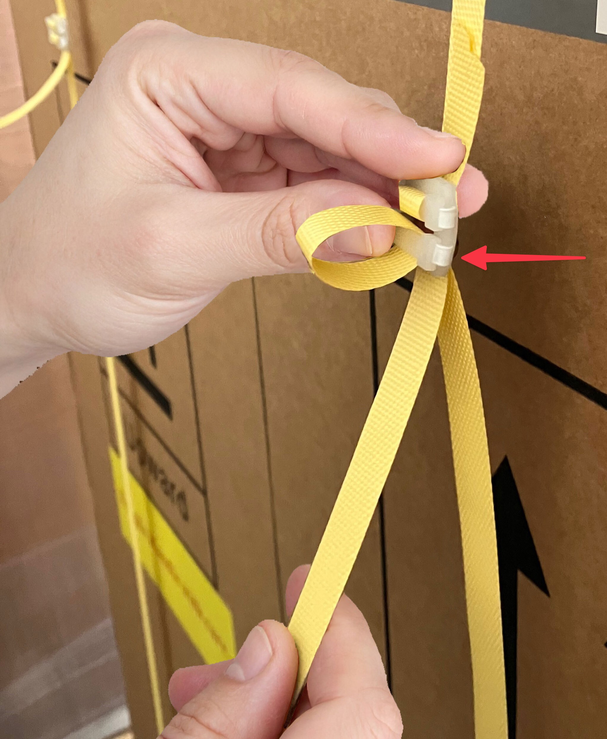 - 梱包紐で箱の四方を囲むように固定します(「梱包紐の締め方」を参照)。