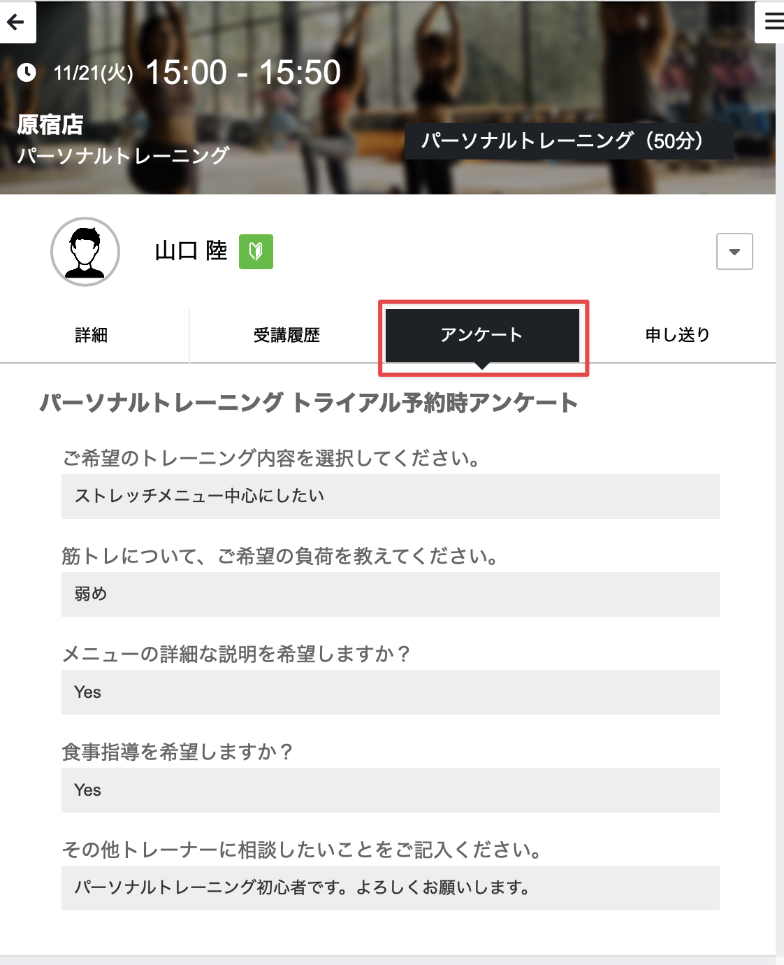 スタッフ管理サイトからレッスン受講メンバーのアンケートの回答を確認する