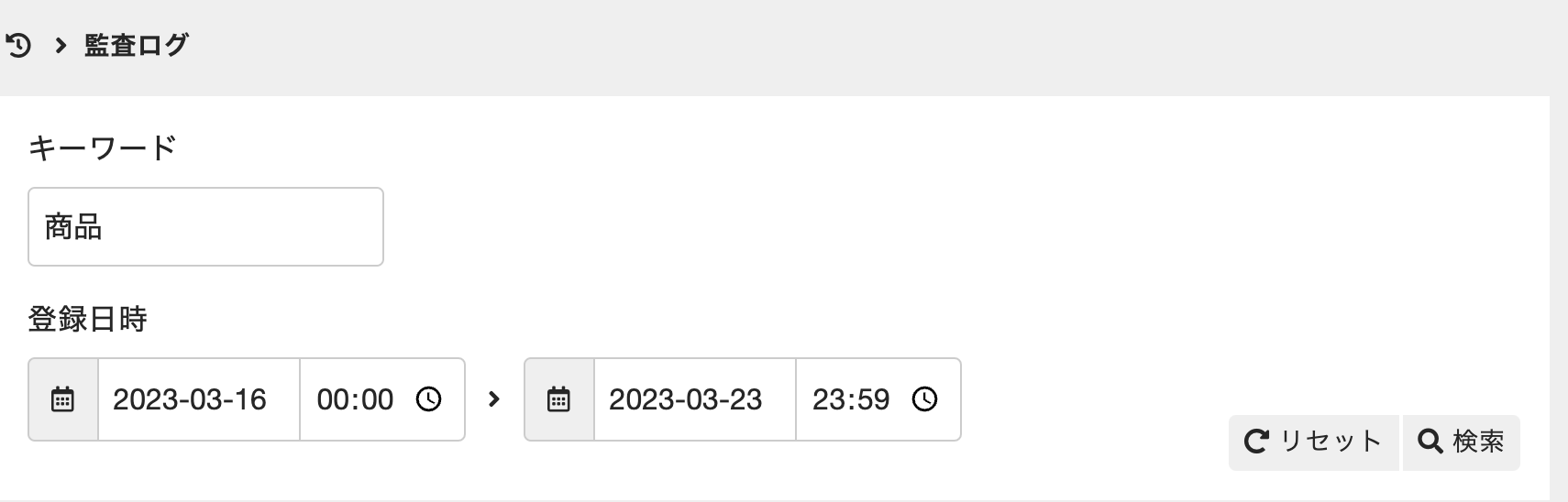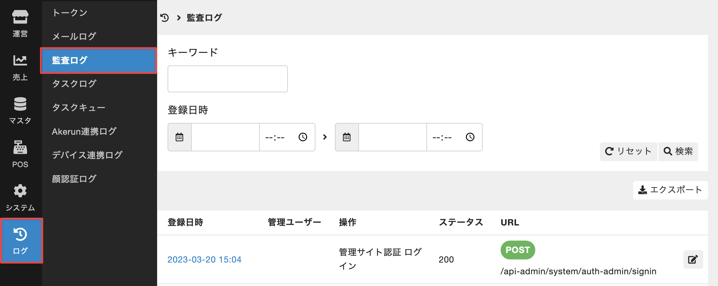ログが表示されます。 - 表示されているログの一覧を絞り込みたい場合は、絞り込みキーワードを[キーワード]に、確認したい操作の日時を[登録日時]に入力して[検索]をクリックします。
