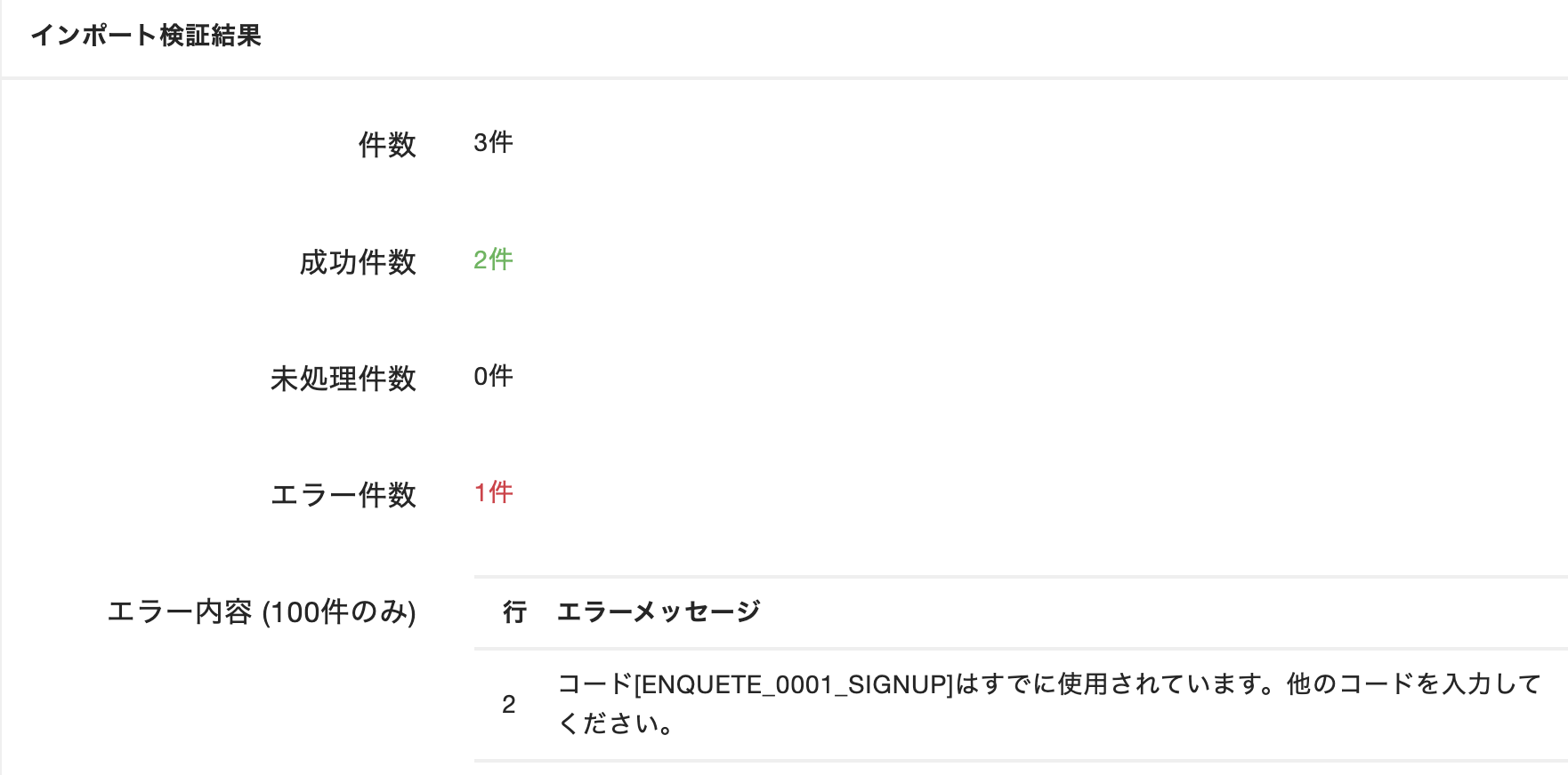 [エラー件数]が「0件」ではなかった場合、[エラー内容]を確認して、エラーの件数が0件になるまでCSVファイルを修正します。