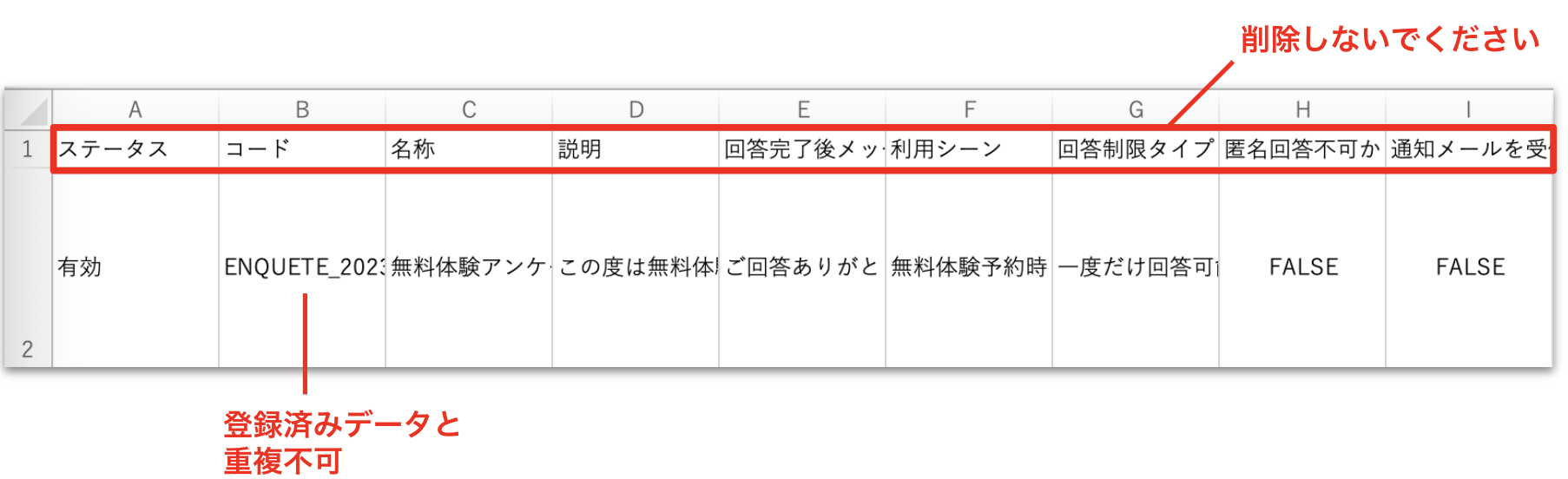 エクスポートしたCSVファイルには、項目名がヘッダー行(1行目)に、登録済みのアンケートの設定項目のデータが2行目以降に入力されています。ヘッダー行は削除しないでください。
