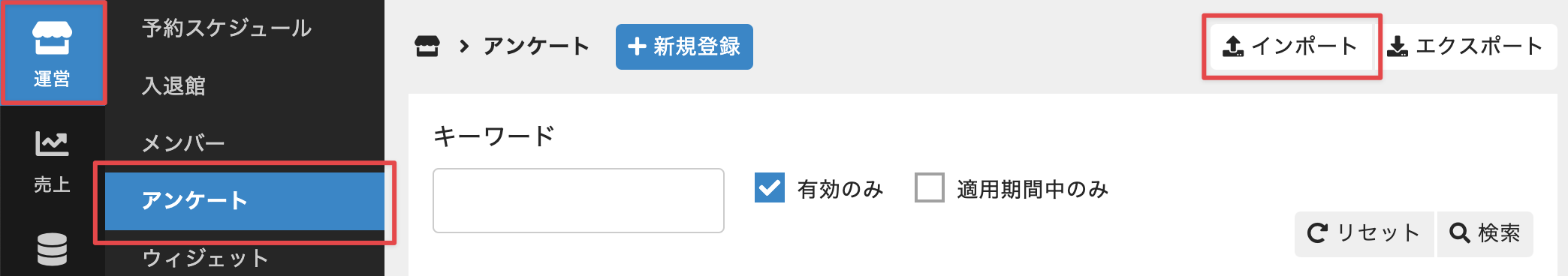 - 管理サイトのサイドバーから[運営]>[アンケート]を選択し、アンケート画面で[インポート]をクリックします。