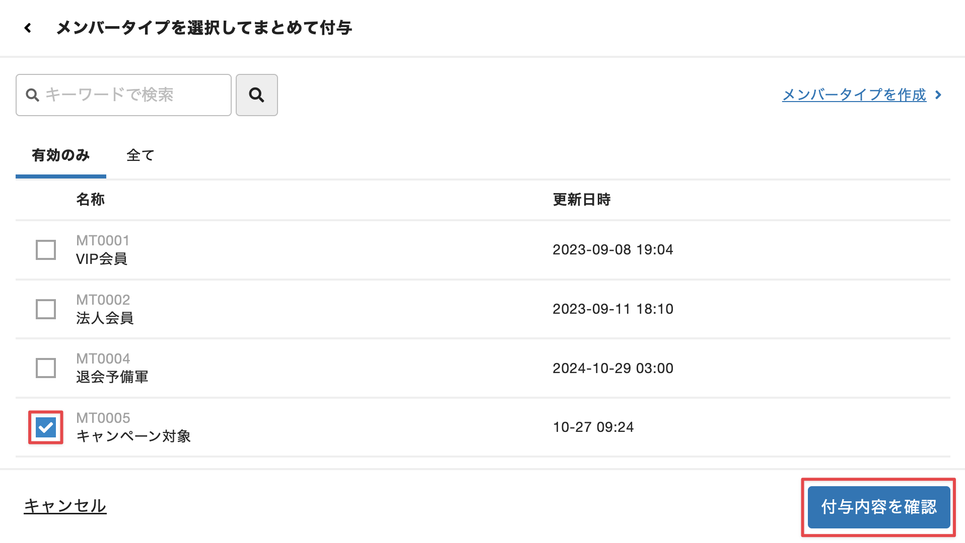 Note:付与するメンバータイプが未登録の場合、[メンバータイプを作成]をクリックしてメンバータイプを新規登録できます。 - 確認画面が表示されるので、付与するメンバータイプと対象者の人数を確認し、[まとめて付与]をクリックします。