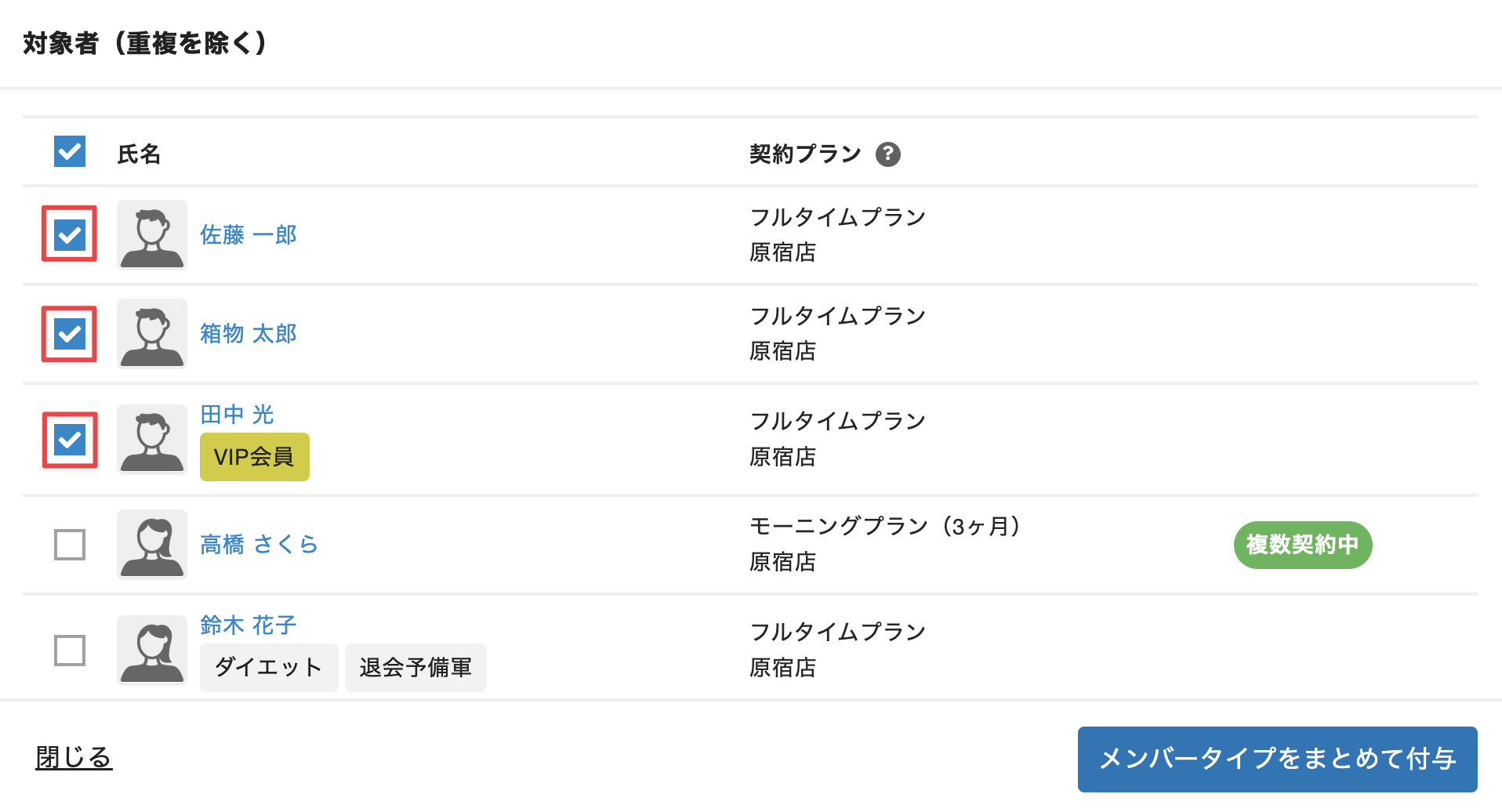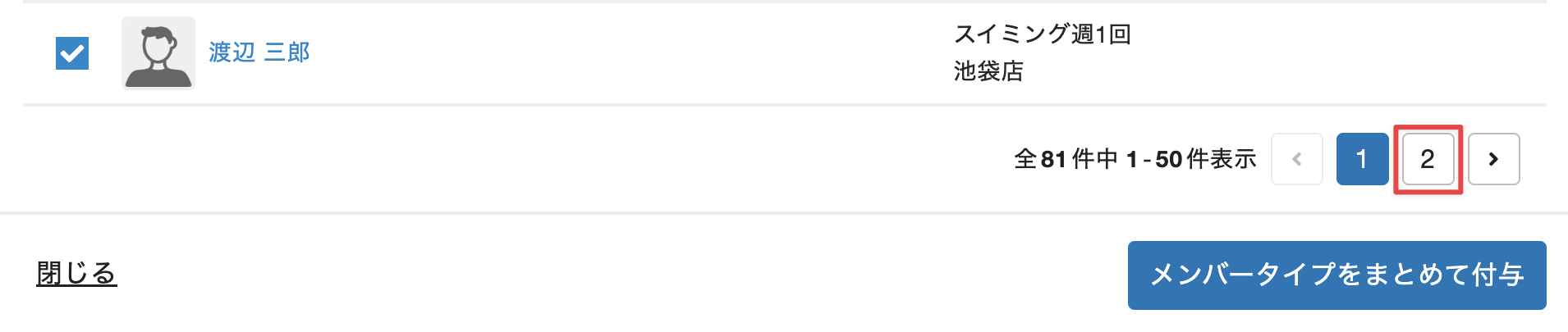 注意:最も上のチェックボックスは、他のページの選択と連動しているため、チェックが入っている状態からチェックを外すと、他のページも連動してすべてのメンバーのチェックが外れます。1ページ目で1人でも付与対象とした場合、2ページ目以降のメンバーを付与対象とするときは、一人ひとり個別にチェックを入れてください。 - [メンバータイプをまとめて付与]をクリックします。