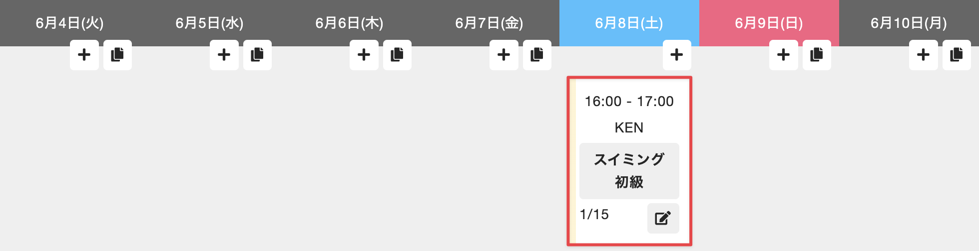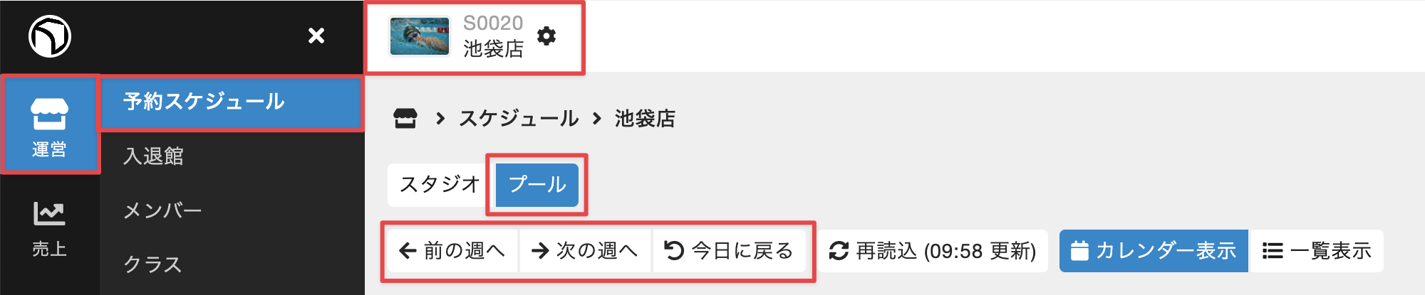 - 管理サイトのサイドバーから[運営]>[予約スケジュール]を選択し、店舗名、予約カテゴリ、レッスン日の週を選択します。