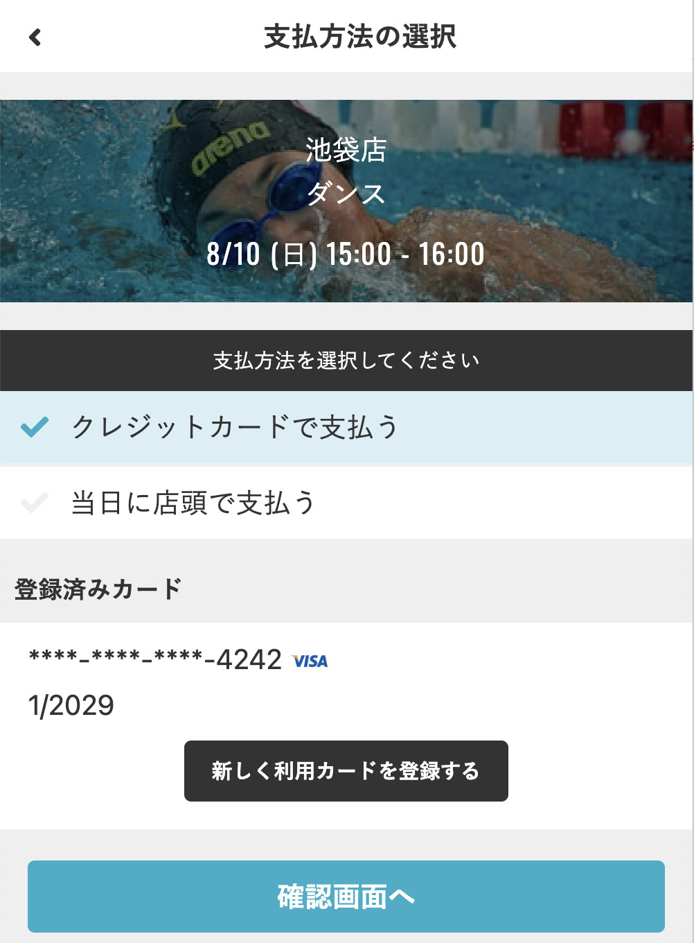 - 手順6で[チケットを購入して予約する]をタップした場合、支払方法を選択し、[確認画面]へをタップします。確認画面が表示されるので、[上記内容で予約する]をタップします。