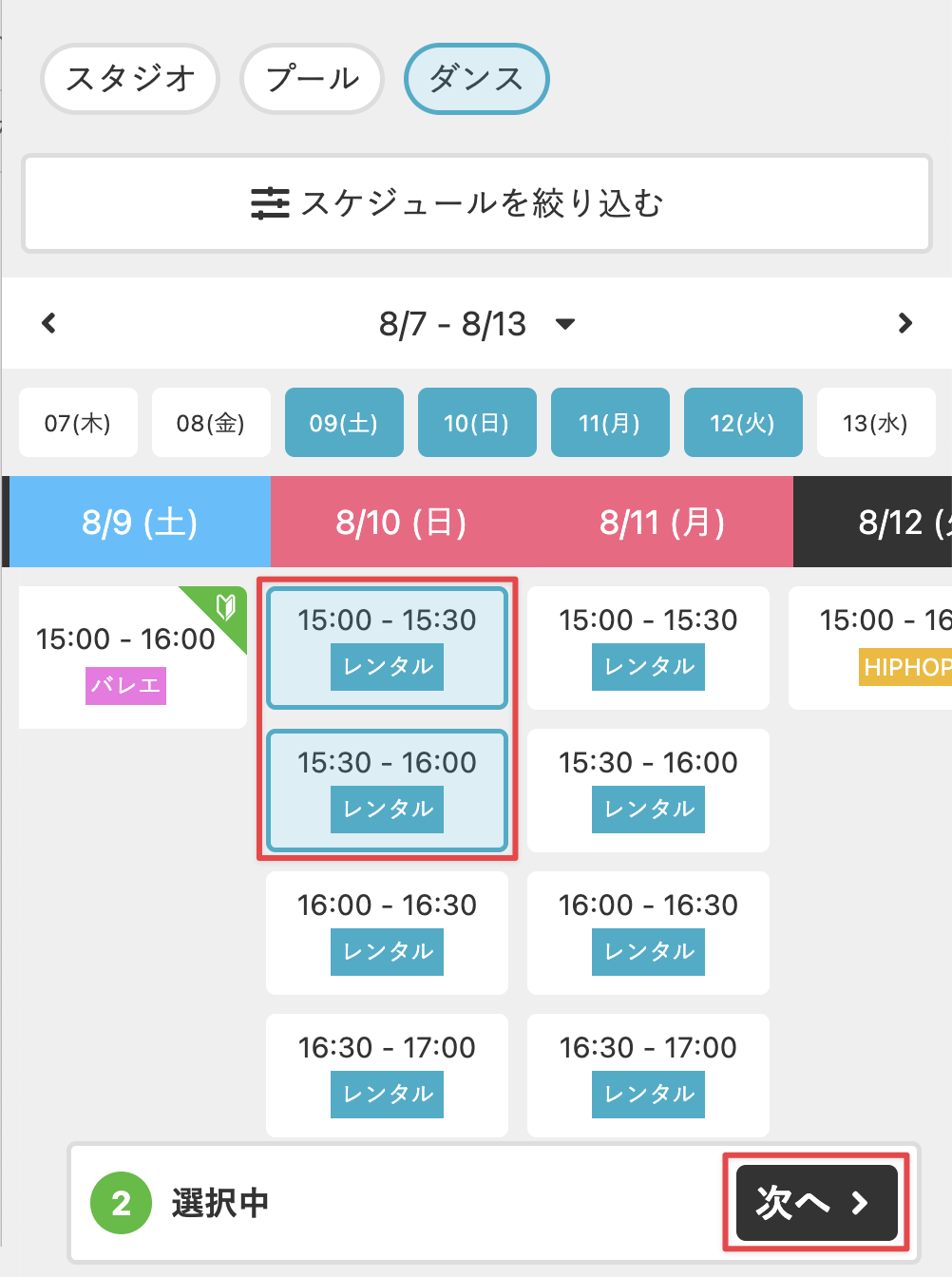 - 予約する予約枠(レッスン)を複数タップして、[次へ]をタップします。