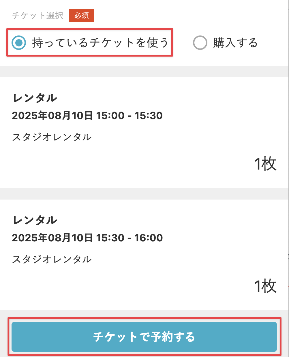 所持チケットで予約する場合、有効期限の最も近いチケットが自動で消費されます。