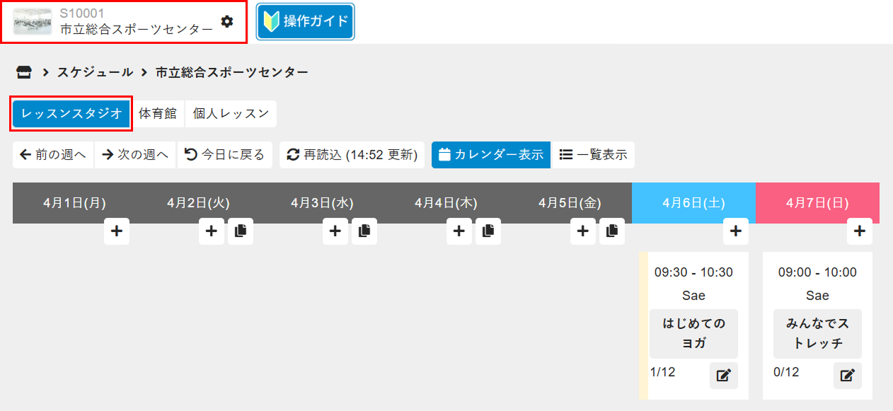 - 画面上部の店舗、予約カテゴリを選択し、スケジュールが反映されていることを確認します。