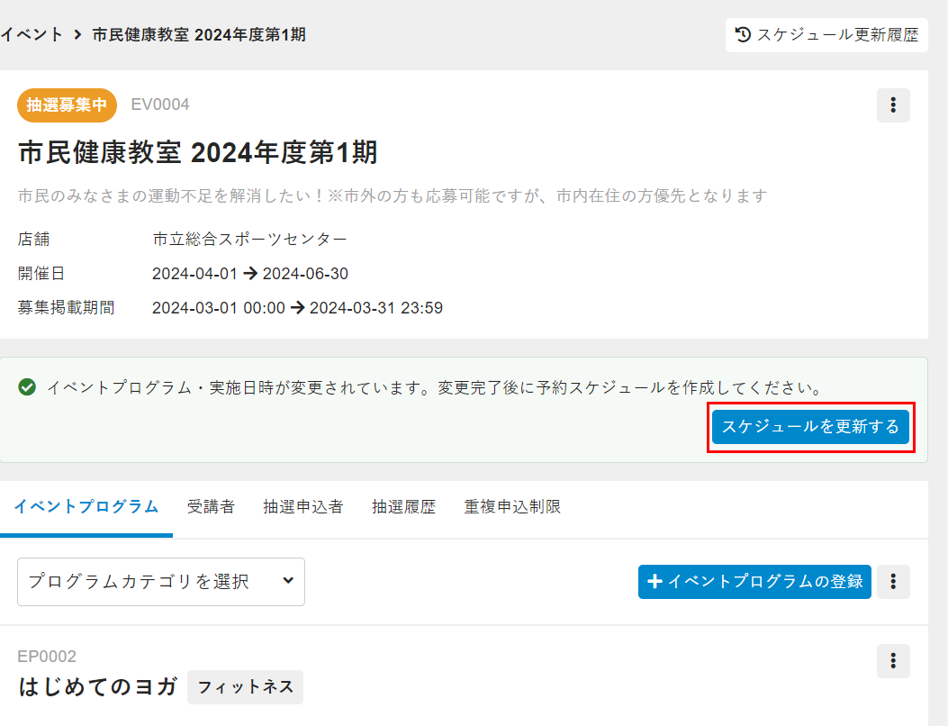 - 実施日時の登録後に表示される[スケジュールを更新する]をクリックします。