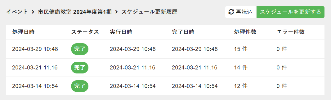 スケジュール更新履歴画面が表示されるので、[再読込]をクリックして、[ステータス]が[完了]と表示されることを確認します。