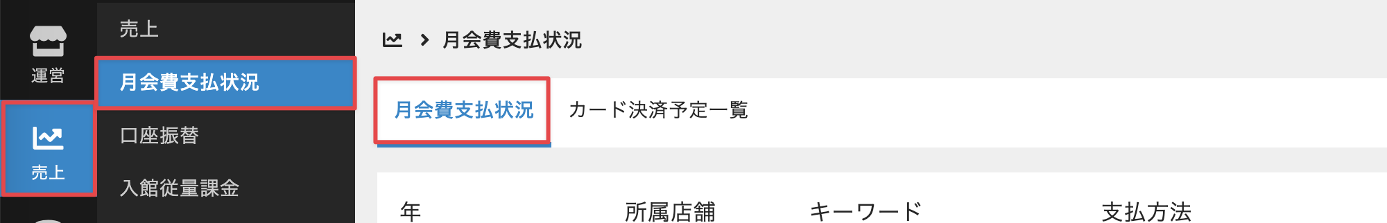 - 管理サイトのサイドバーから[売上]>[月会費支払状況]を選択し、[月会費支払状況]タブを選択します。