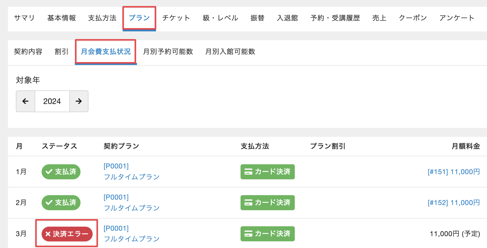 - 決済エラーの発生しているメンバーだけが表示されます。