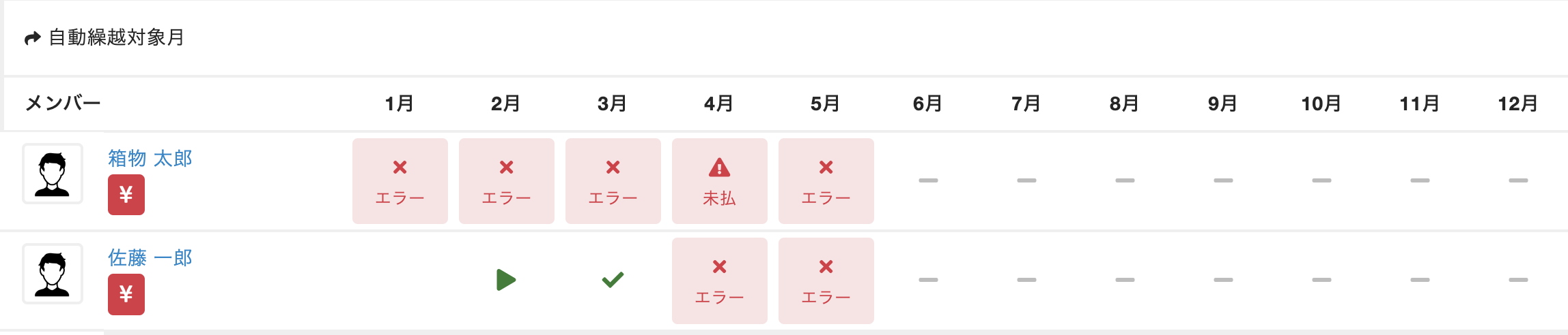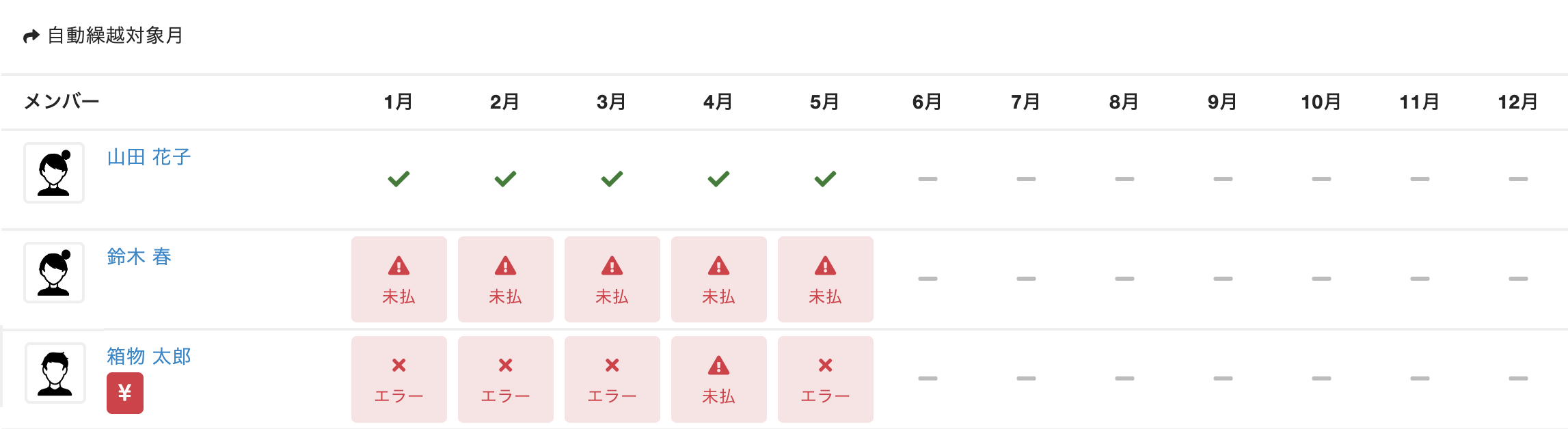 [エラー]または[未払]が表示されているメンバーを確認します。