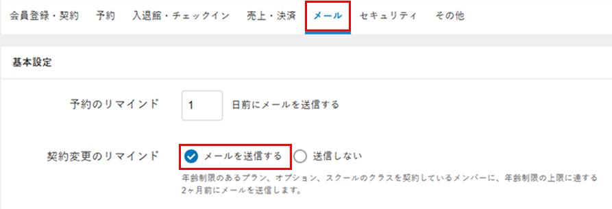 管理サイトのサイドバーから[システム]>[設定]>[システム設定]を選択し、[メール]タブの[基本設定]にある[契約変更のリマインド]で[メールを送信する]を選択することで通知が有効になります。