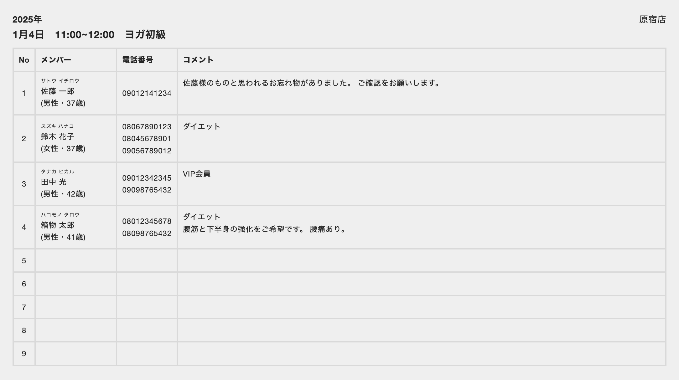 固定枠予約のレッスンの出席簿: