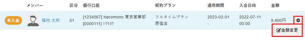 - 該当メンバーの右端にある歯車アイコンをクリックし、[金額変更]を選択します。