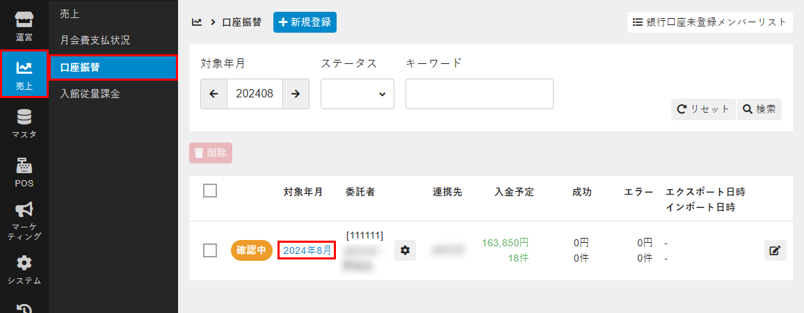 - 管理サイトのサイドバーから[売上]>[口座振替]を選択し、口座振替一覧で該当の口座振替対象年月をクリックします。