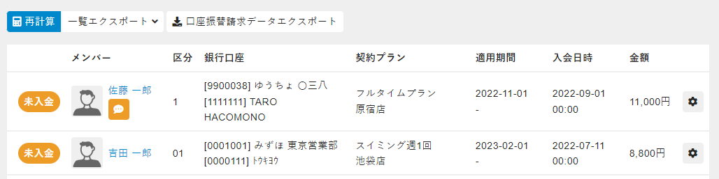 - [未入金]:今回の口座振替手続きで支払い予定のメンバー