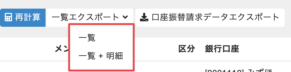 Note:一覧で確認したい場合は、[一覧エクスポート]をクリックして、[一覧]または[一覧 + 明細]を選択します。CSVファイルがダウンロードされます。CSVファイルの内容を確認します。