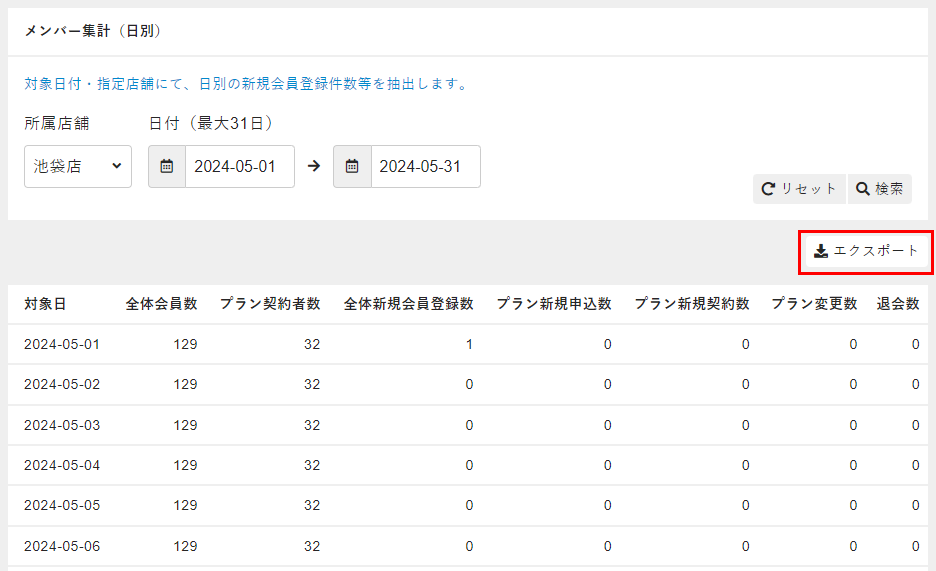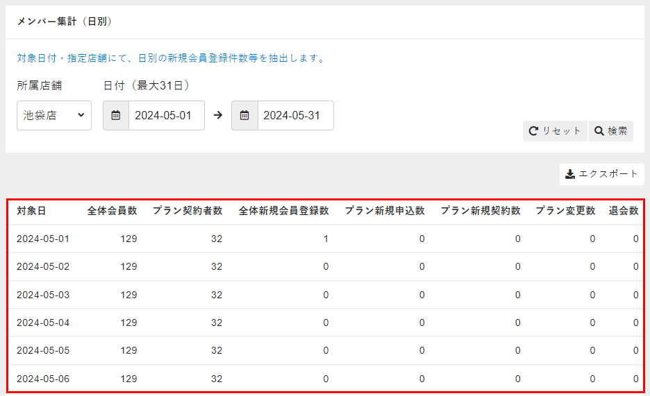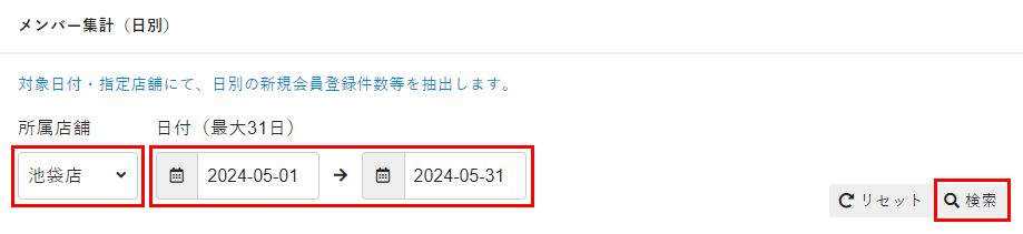 [所属店舗]、[日付]を設定し、[検索]をクリックします。