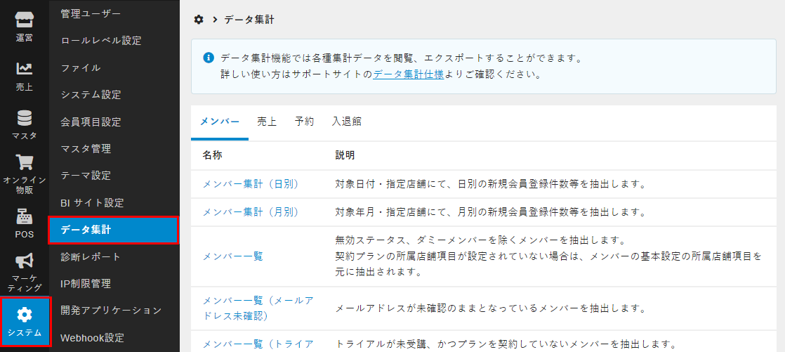 - 管理サイトのサイドバーから[システム]>[データ集計]を選択します。