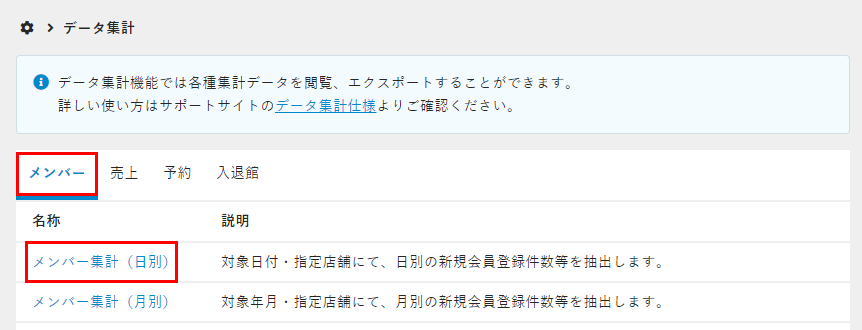 Note:データ集計画面の上部にある「データ集計仕様」をクリックすると、データ集計仕様画面が表示され、集計データの仕様を確認することができます。 - データ集計するタブを選択し、名称をクリックします。ここでは、[メンバー]タブの[メンバー集計(日別)]を選択したときの手順を説明します。