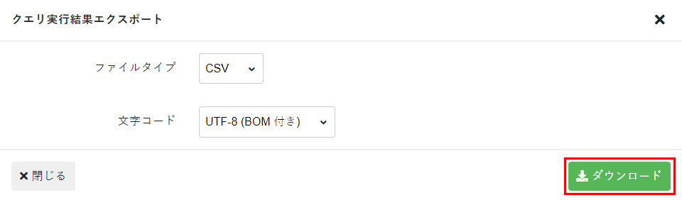 Note:[ファイルタイプ]で[TSV]を選択すると、TSV形式でファイルがエクスポートされます。TSV形式では、各項目がカンマ(,)はなく、タブで区切られます。 - [文字コード]から[UTF-8(BOM付き)]を選択します。