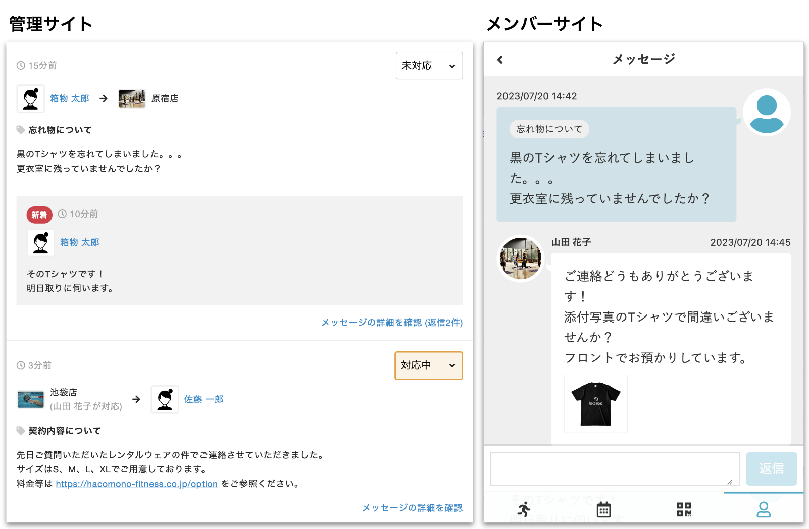 - 履歴が残る:管理サイト・メンバーサイトに、やりとりの履歴がすべて残ります。過去の経緯まで確認して適切な対応を行うことができます。
