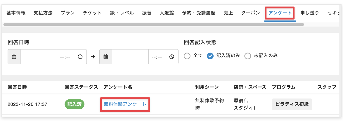 [アンケート]タブを選択し、確認したいアンケート名をクリックします。