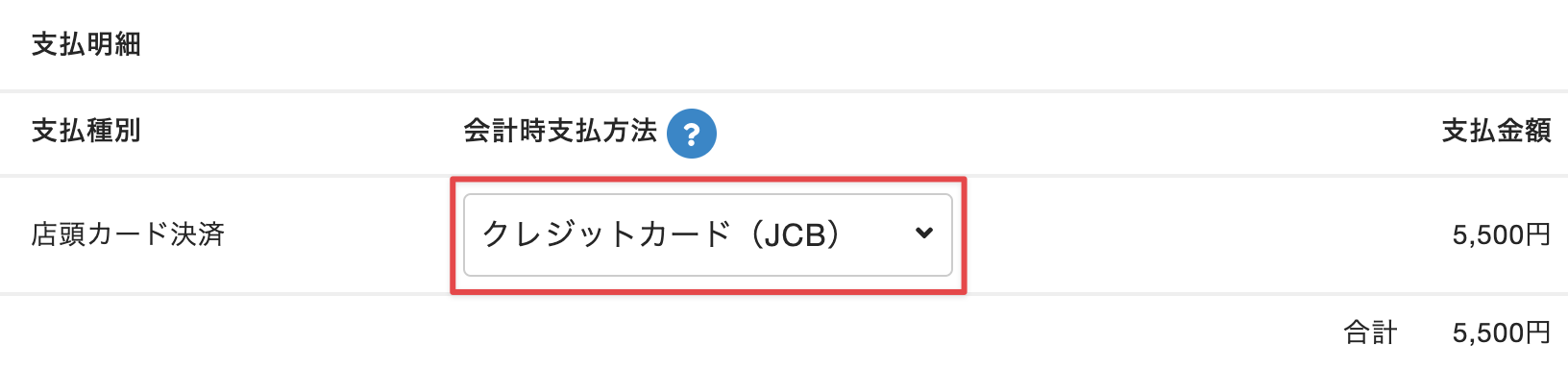 [支払明細]で、変更対象の明細の[会計時支払方法]から変更後の会計時支払方法を選択します。