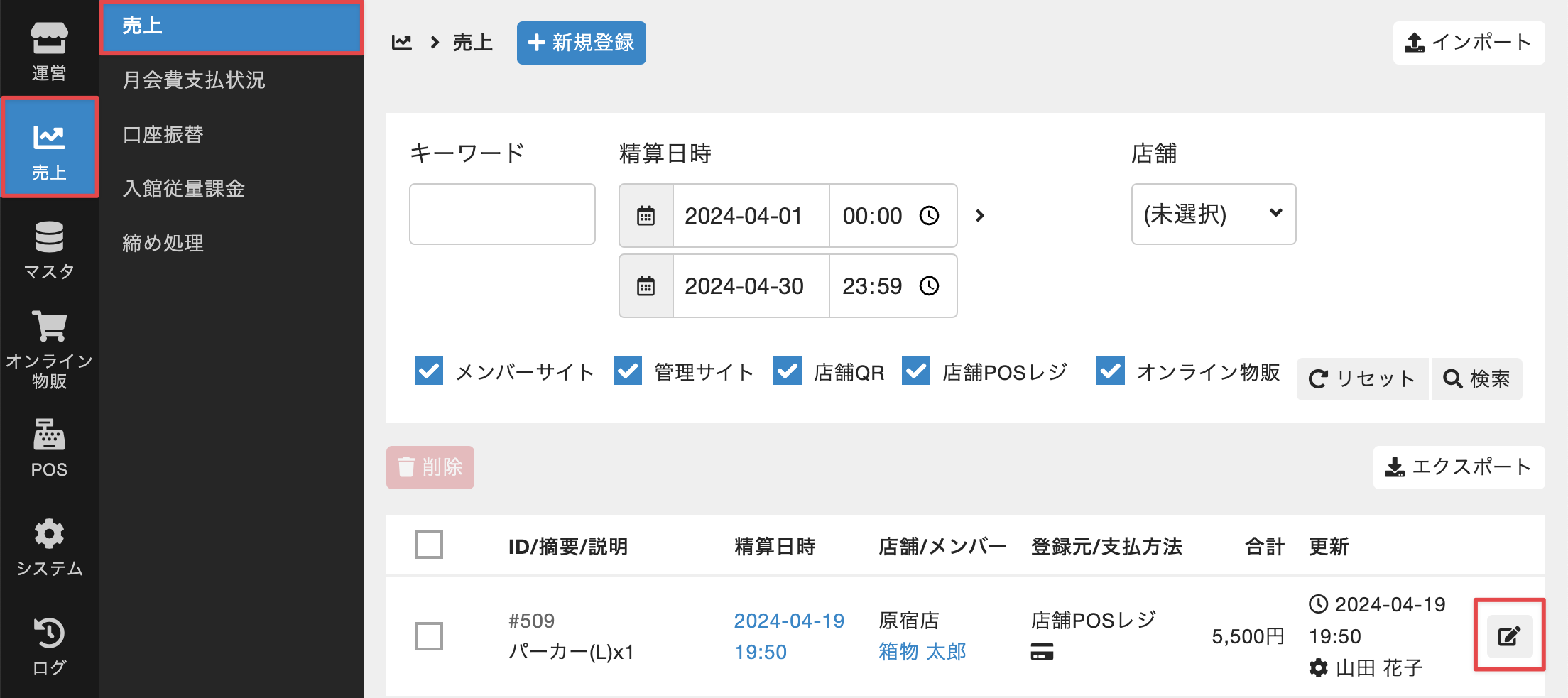 - 管理サイトのサイドバーから[売上]>[売上]を選択し、売上の一覧画面で変更対象の売上の編集アイコンをクリックします。