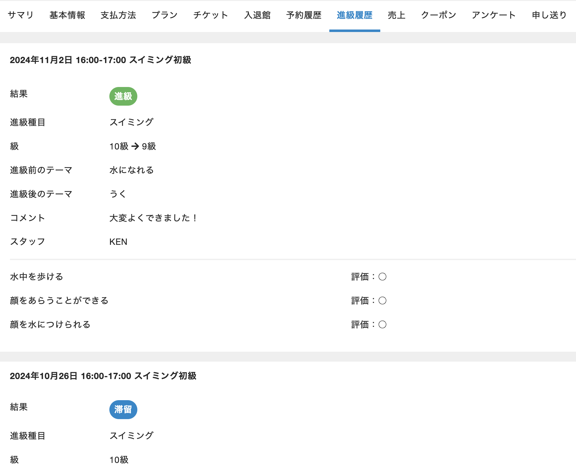 - 進級テストの履歴が表示されます。
