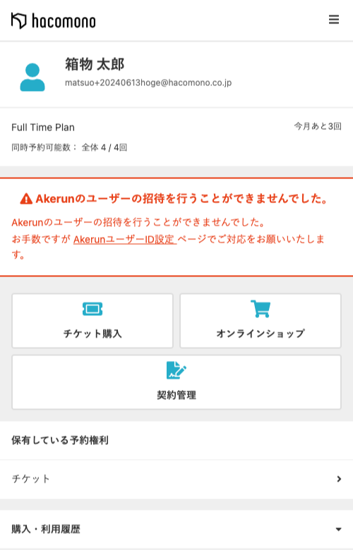 過去にAkerunユーザーとして登録されていたメールアドレスを使ってhacomonoに会員登録した場合、Akerun側でユーザー招待エラーとなるため、Akerun鍵が自動で付与されません。