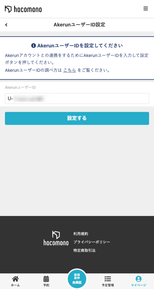 [AkerunユーザーID]にAkerunユーザーIDを入力し、[設定する]をタップします。
