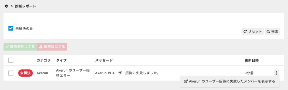 管理サイトのサイドバーから[システム]>[診断レポート]を選択し、[タイプ]に[Akerun のユーザー招待エラー]が表示されているものがAkerunのユーザー招待エラーです。該当のメンバーを確認するには[⋮]>[Akerunのユーザー招待に失敗したメンバーを表示する]を選択してメンバー詳細画面を表示します。