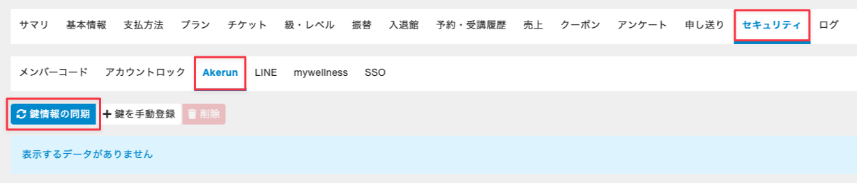 メンバー詳細画面で[セキュリティ]>[Akerun]タブを選択し、[鍵情報の同期]をクリックします。