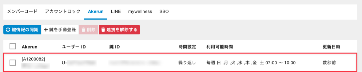 毎日午前0時のAkerun鍵の自動付与・削除バッチ処理が実行されるか、手動で鍵情報の同期を行うと、繰り返し鍵が付与されます。